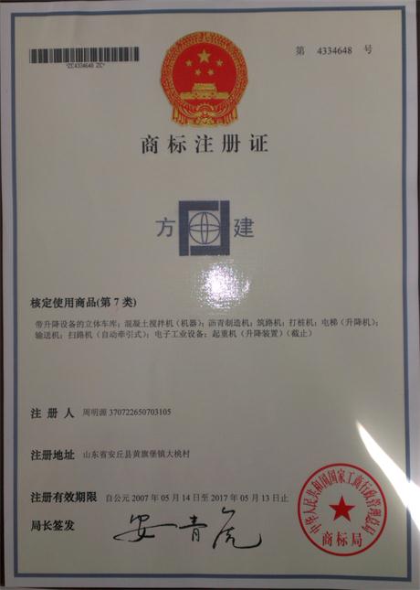 濰坊方建建機(jī)商標(biāo)注冊證書